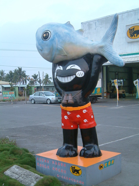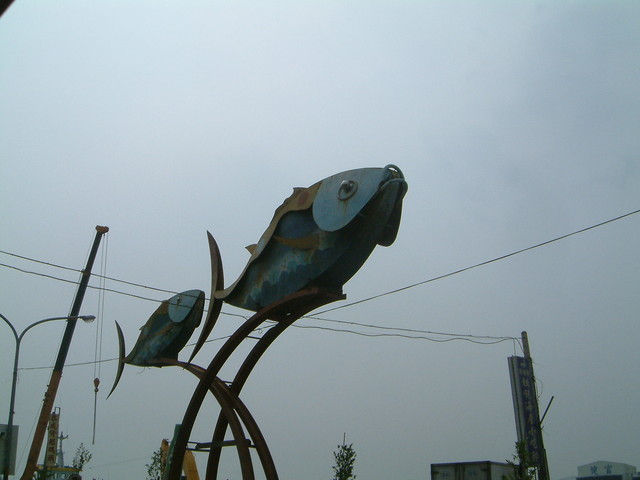 東港渡船口前 中央分隔島 鐵製的黑鮪魚 由於天天在外面日曬雨淋 已經有點斑駁 也看到黑鮪魚流淚