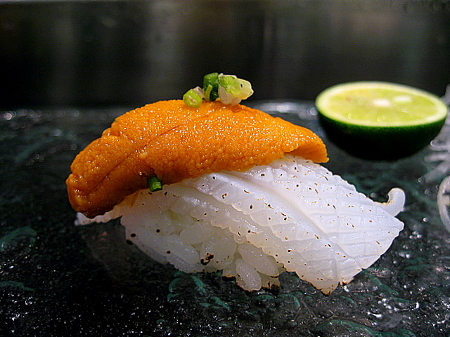 海膽+軟絲 阿城師說明軟絲已經有切花並微炙過