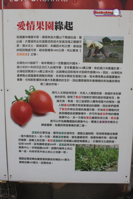 看板展示這個果園的發展緣起,其實在進入WTO之後,台灣的農業需要轉型,朝精緻農業發展,所以朝高產值的作物,或是休閒農業著手。