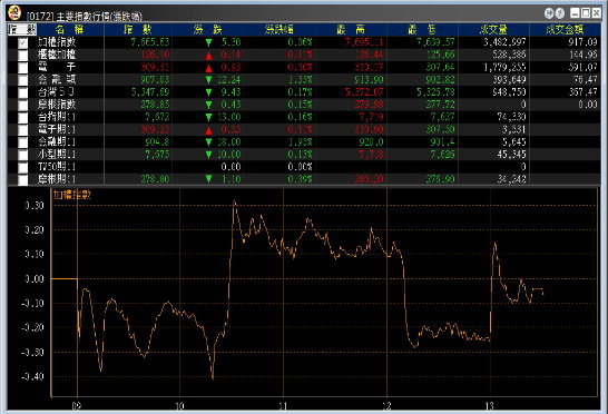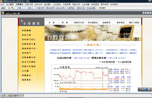 在這系統內可以看到主要指數的一些變化,當然對於做一些指數期貨的朋友是很重要的資訊,像我這種小咖,就看一下指數的趨勢就可以啦!不知道大盤的趨勢,貿然投資個股是很危險的啊,有時候血本無歸,股票變壁紙的新聞也常有所聞!