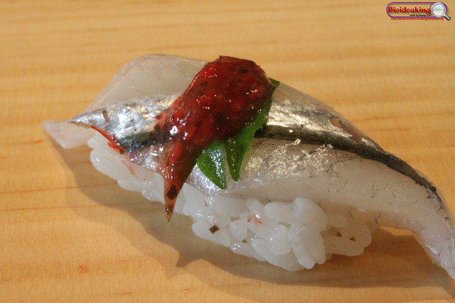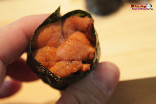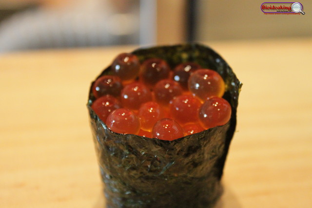吃下鮭魚卵(筋子)之後,感覺彈性十足,有詢問過阿中師傅是否為筋子?答案是正確的!但是唯一美中不足的是!我拍照的時間太長,海苔受潮嚴重。