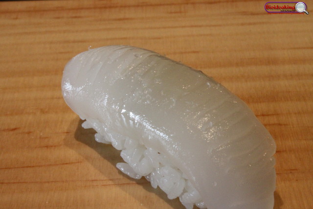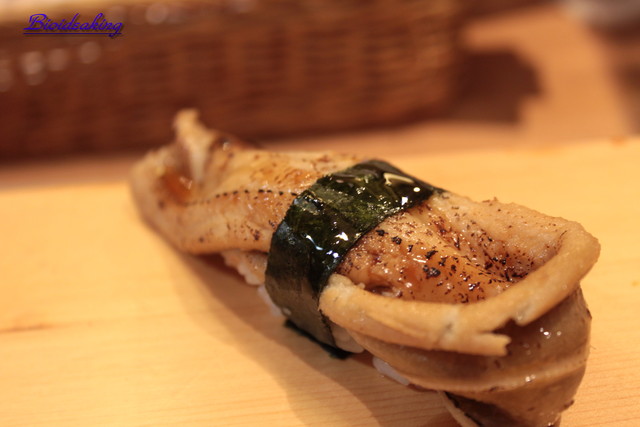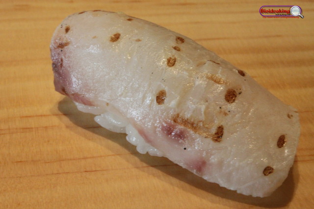 炙鮭魚(師傅招待),跟平常用瓦斯噴槍的炙法不同,帶點微焦及一點點的小苦味!但仍然不失其魚貨的品質。