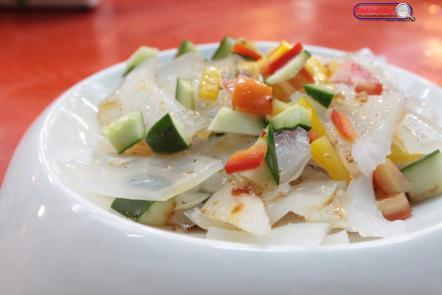 涼拌河豚皮,太過於滑溜,幾乎很難用筷子夾取,涼拌的味道還不差,就是取用不方便吧